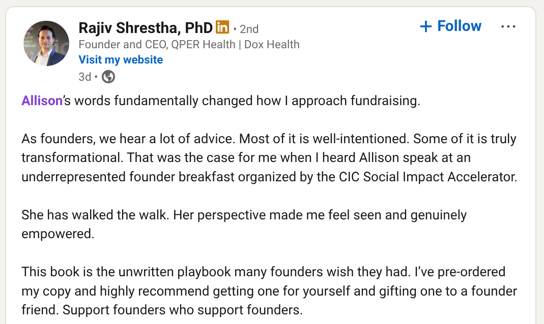 This book is not a “how to raise VC” fantasy or a glossy “how to hustle and tell a great story” version. It's a real guide to raising capital while navigating bias, power dynamics, warm intros, and the invisible rules nobody explains.