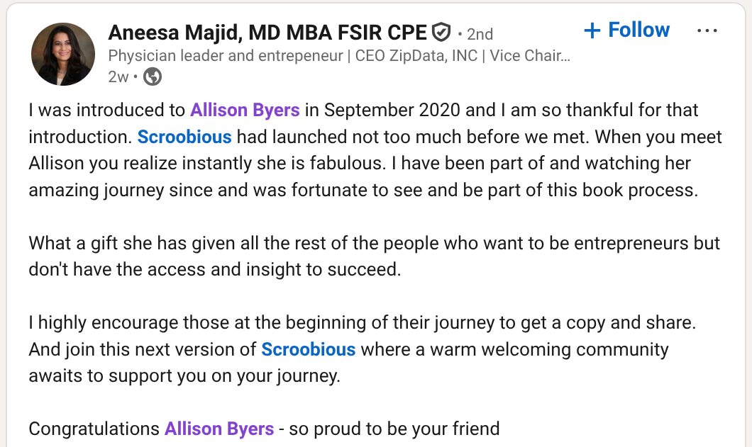 Allison Byers is a founder, investor, and capital access advocate working to build a funding system that includes The Rest of Us. She’s the founder and CEO of Scroobious, a relationship-first platform that helps founders and investors build trust to fund innovation. She co-authored California’s landmark SB54 law requiring venture capital firms to publicly report diversity data; the first law of its kind in the U.S.